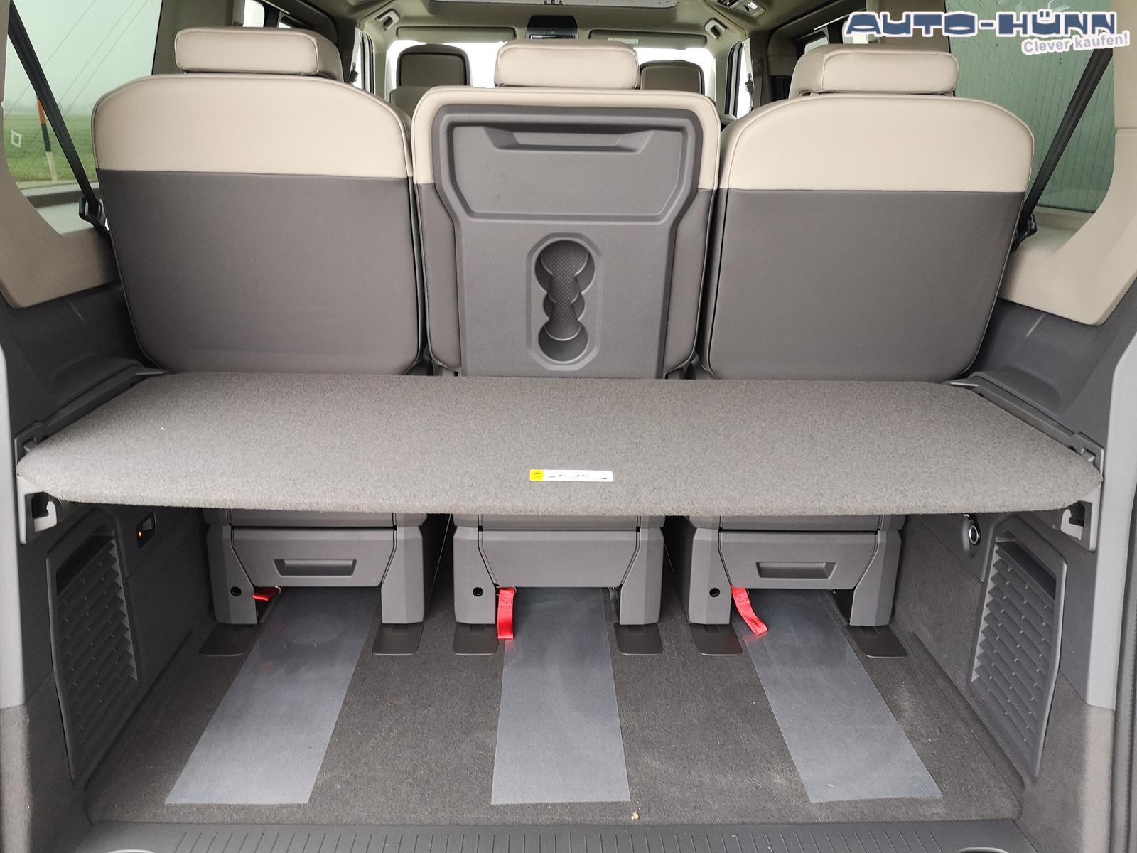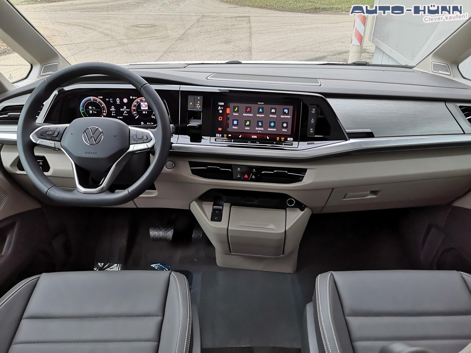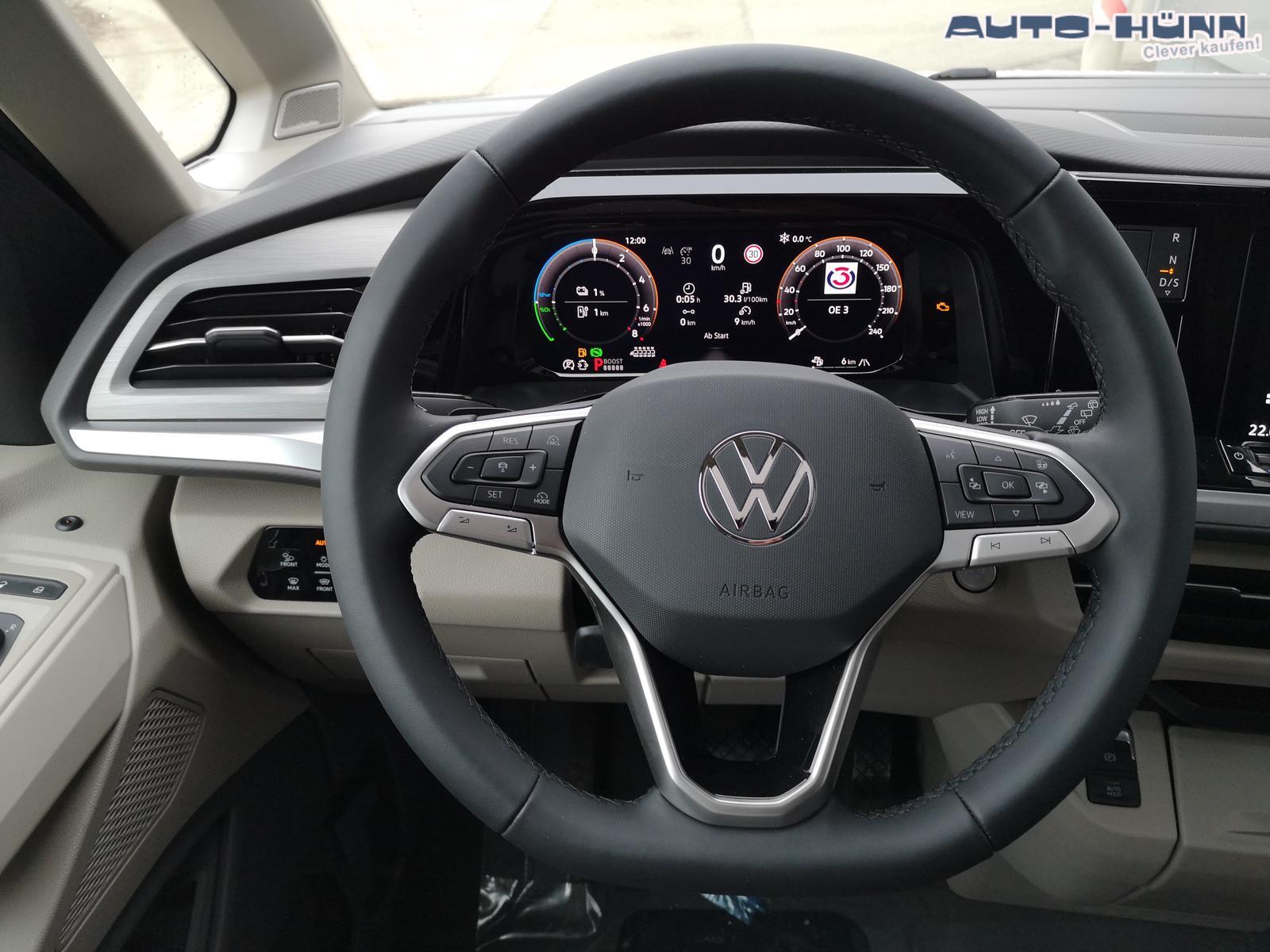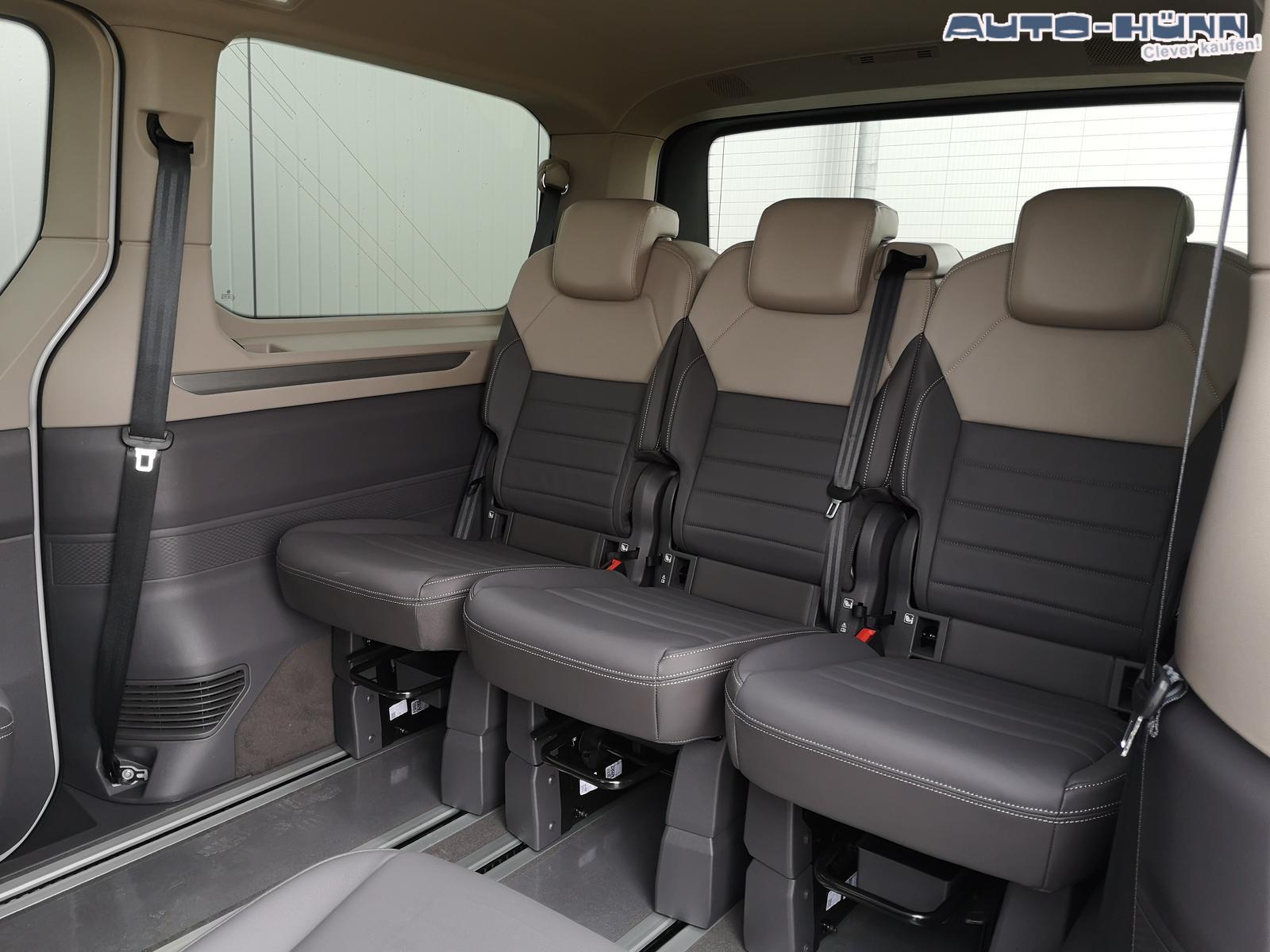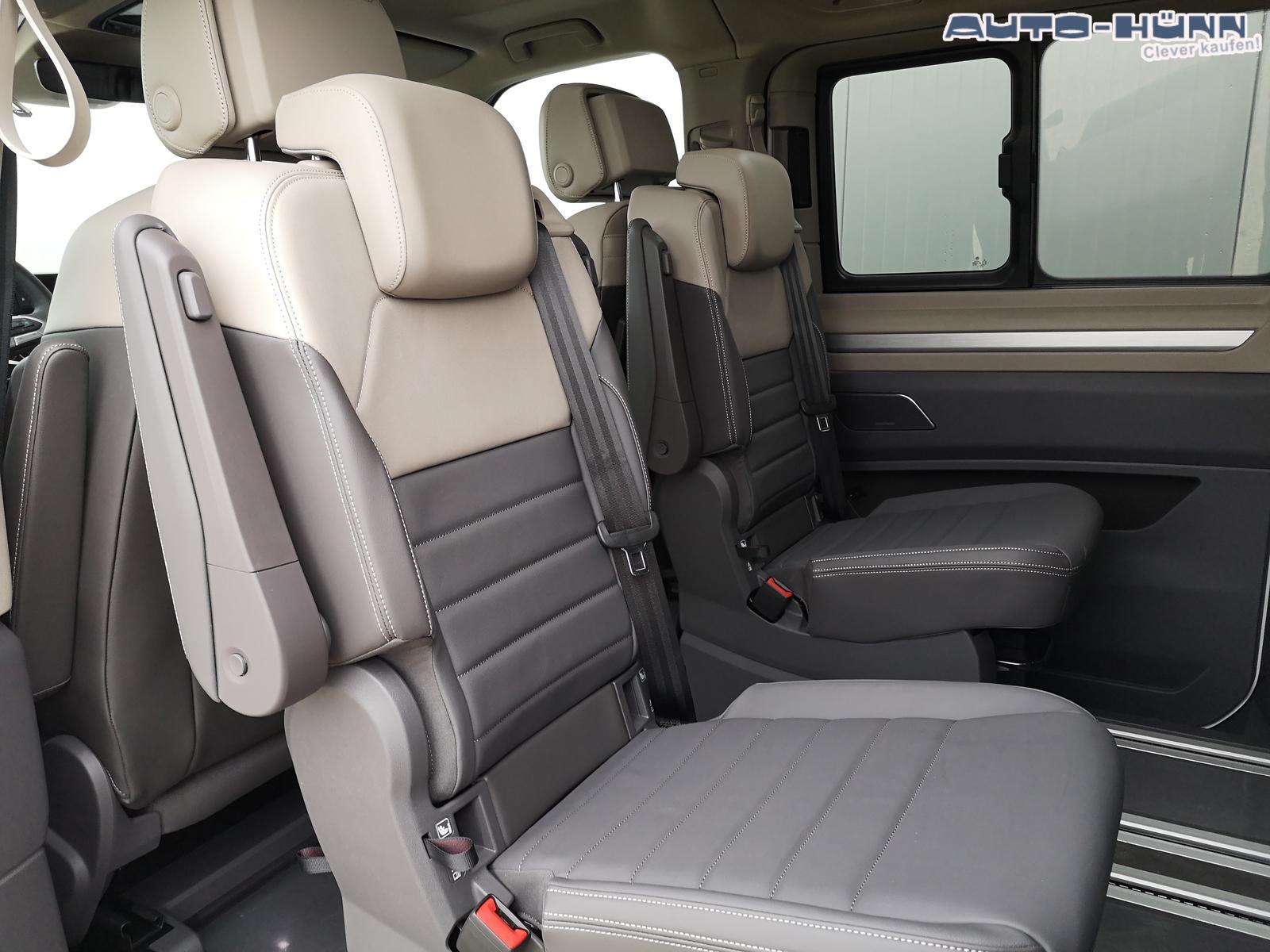 Fahrzeug 8-fach-bereift, Leichtmetallräder 7,5J x 18 (Sport Edition Design TN28, schwarz glanzgedreht) mit Sommerreifen 235 50 R18, Leichtmetallräder 7,5 J x 18 ""Toshima"" schwarz mit Winterreifen (M+S Kennung inkl. Schneeflocke / Allwetterreifen), (0NP) Bulliplakette am Kotflügel, (1U3) Bodenschienen mit Multifunktionstisch inkl. 3 Becherhalter, verschiebbar auf der vollständigen Länge des Schienensystems, (2FT) Multifunktionslederlenkrad beheizbar mit Schaltwippen, (4A3) Sitzheizung vorne, (4GX) Frontscheibe beheizbar und geräuschdämmend, (4K5) Zentralverriegelung Keyless Advance (schlüsselloses Öffnen und Starten),(6I6) Travelassistent, (6KF) Scheinwerferleiste hinterleuchtet, (7AL) Diebstahlwarnanlage, (7J2) Digital Cockpit Pro, (7UY) Radio Navigationssystem Discover Pro, (9AH) Klimaanlage ""Air Care Climatronic"", (N0K) Sitzbezug Bi-Colour Leder ""Savona"", (1D2) Anhängerkupplung schwenkbar, (Z8A) Schiebefenster im Fahrgastraum links und rechts, Fenster ab B-Säule abgedunkelt, (ZBR) 7 Sitzer: Sitzvariante 2-2-3 (Vis-a-Vis entgegen der Fahrrichtung) inkl. 4 Armlehnen, (1LB) Fahrwerk 17 Zoll, (2H5) Fahrprofilauswahl, (3FG) Panoramaglasdach, (7VL) Warmwasserstandheizung im Fahrerhaus inkl. FFB, (7W7) Proaktives Insassenschutzsystem, (9IJ) Mobiltelefon-Schnittstelle ""Comfort"" inkl. induktive Ladestation, (9VV) Soundsystem ""Harman Kardon"" inkl. 13 Lautsprecher, 840 Watt Gesamtleistung und Subwoofer, (KS1) Head Up Display, (P2G) Parkpaket Advance, Parklenkassistent inkl. ""Area View"" inkl. Rückfahrkamera, (ZED) Easy Open Paket Advanced, Umfeldbeleuchtung an der Heckklappe, Ambientebeleuchtung 30-farbig, Heckklappe sowie Schiebetüren elektrisch inkl. Easy Open/Close Funktion, ABT Leistungssteigerung auf 132kW/180PS und 400Nm Drehmoment.
