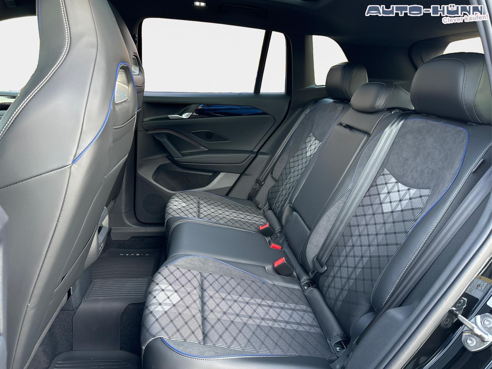 R-Line Sportsitze mit integrierter Kopfstütze in Schwarz mit blauer Kontur, Sitzmittelbahnen der Vordersitze und der äußeren Rücksitzplätze in Stoff, Sitzwangen in Art Velours